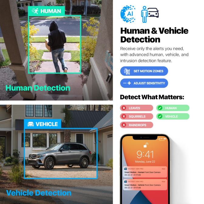 - Smart Motion Detection uses an advanced algorithm to differentiate human and vehicular shapes within a scene and send alarms only when a person or vehicle is detected