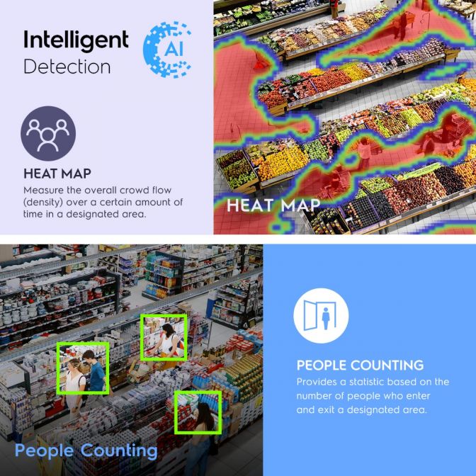 - This camera has built in AI features such as IVS (Tripwire Intrusion) which allow for increased Perimeter Protection as well as the ability to determine the overall crowd flow (density) over a certain amount of time in a specific area using the People Counting and Heat Map