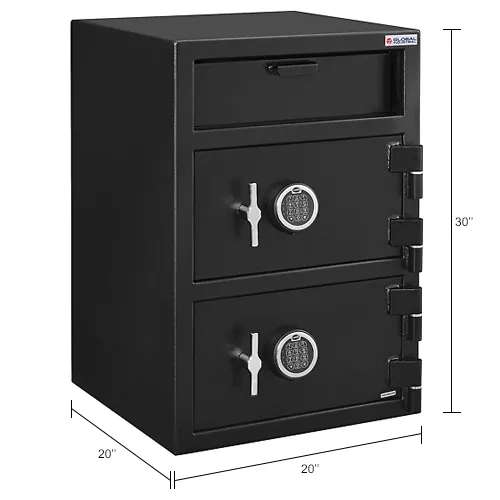 The 3.6 cu. ft. Global Industrial™ Front-Loading B-Rate Depository Safe offers a convenient way to collect and protect deposited money and valuables from theft and robbery. The drop door connects to the top front-loading door to allow deposits without accessing the safe, with a lower, unconnected compartment serving as a separate, isolated safe to restrict access even further. It is ideal for commercial use, like retail, gas stations & convenience stores, where cash deposits from registers are frequent. This model features two electronic digital locks that allows for multiple combinations with a lockout mode if codes are entered incorrectly, with keyed backup entry in the event of a battery failure. Each lock is keyed different for maximum protection.
