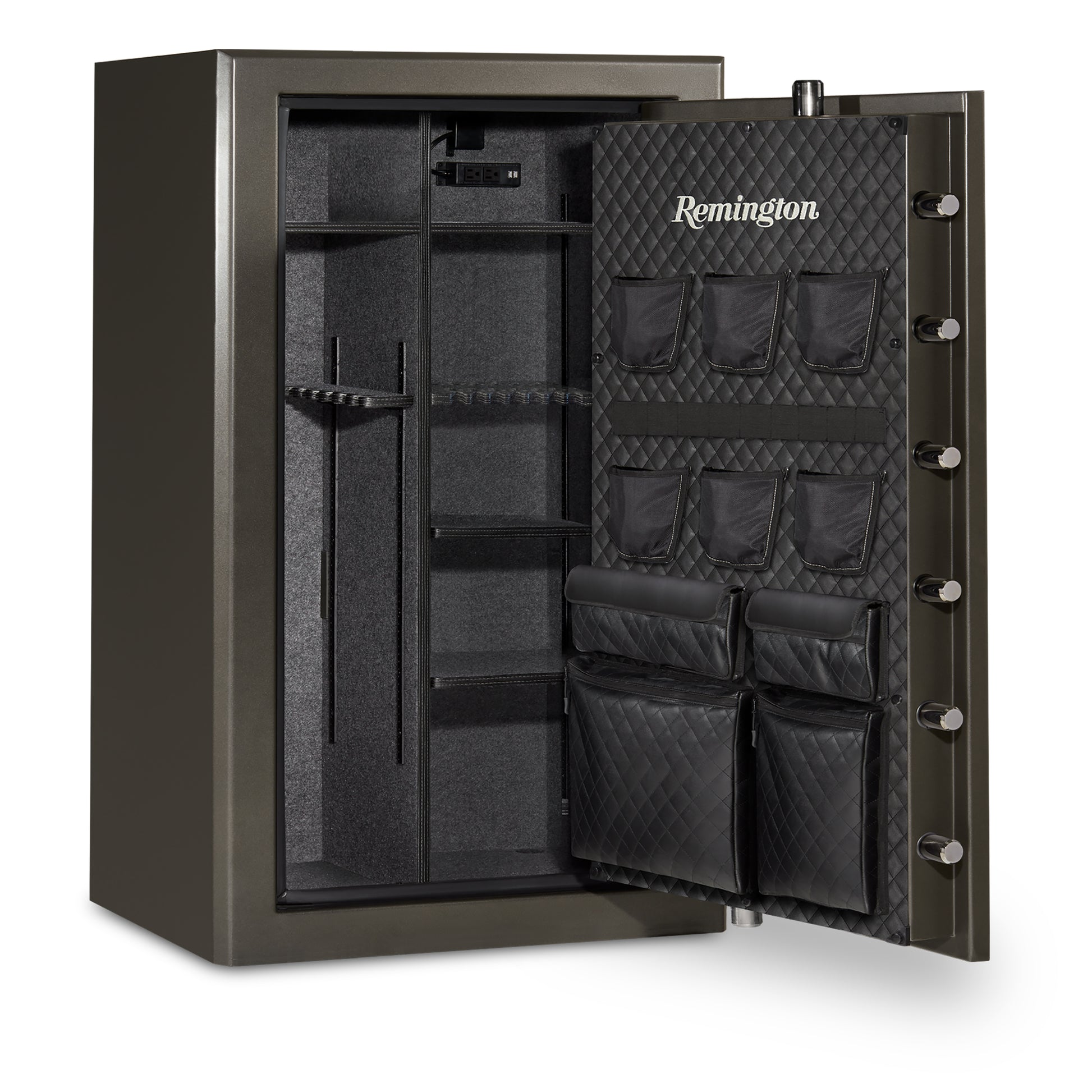 The Remington Express SAR5934E offers high-level security for 34 long guns and 6 handguns. It provides a robust 60-minute fire rating at 1650°F and 7-day waterproof protection (2 ft) via Triple Seal technology. Security features include an EMP-resistant SecuRam UL-Rated electronic lock and twelve 1.5" steel bolts. The 12-gauge steel body houses a fully carpeted interior with motion-activated LED lights, a power outlet with USB ports, and a premium pocket door organizer. It is CA DOJ approved and backed by a best-in-class Lifetime Warranty.