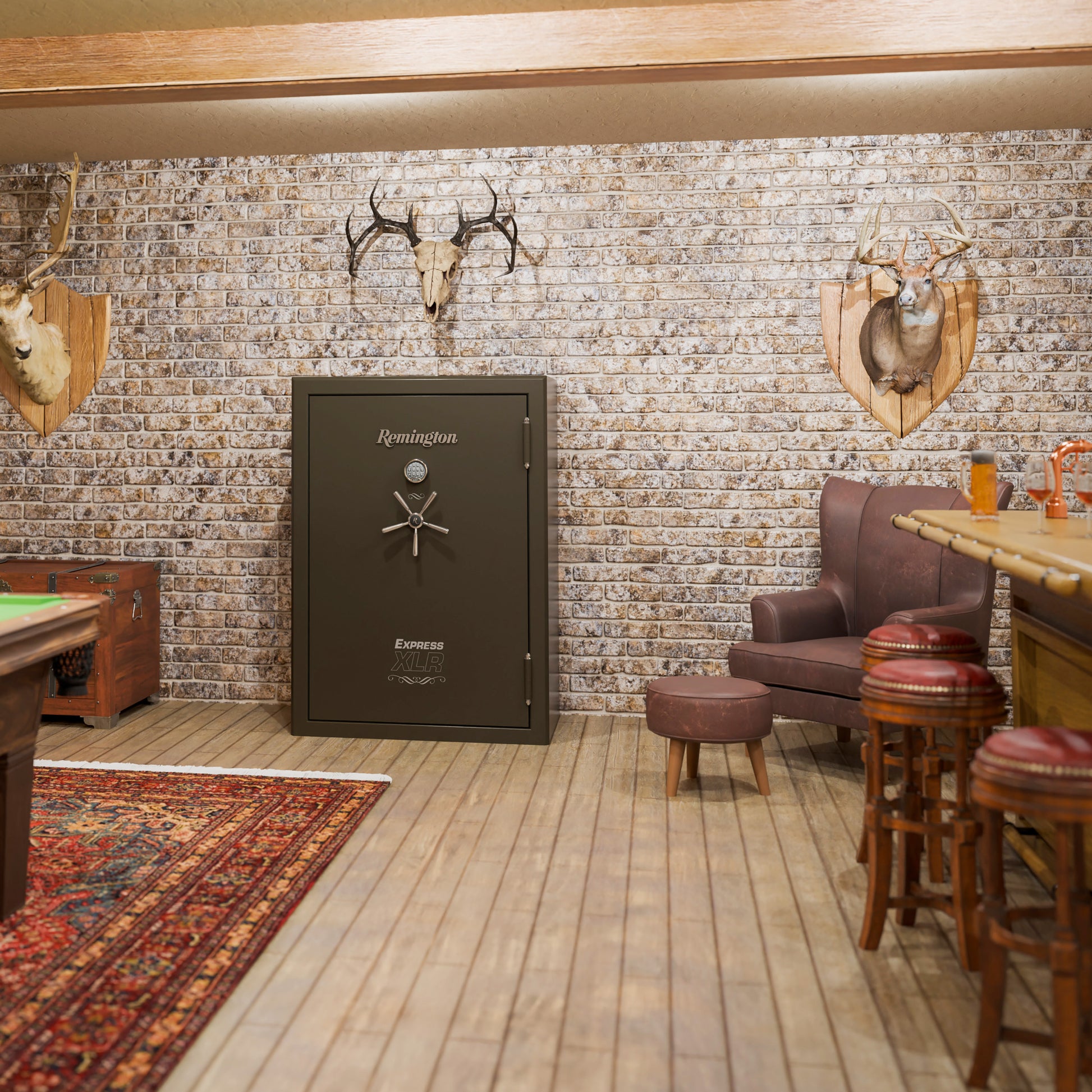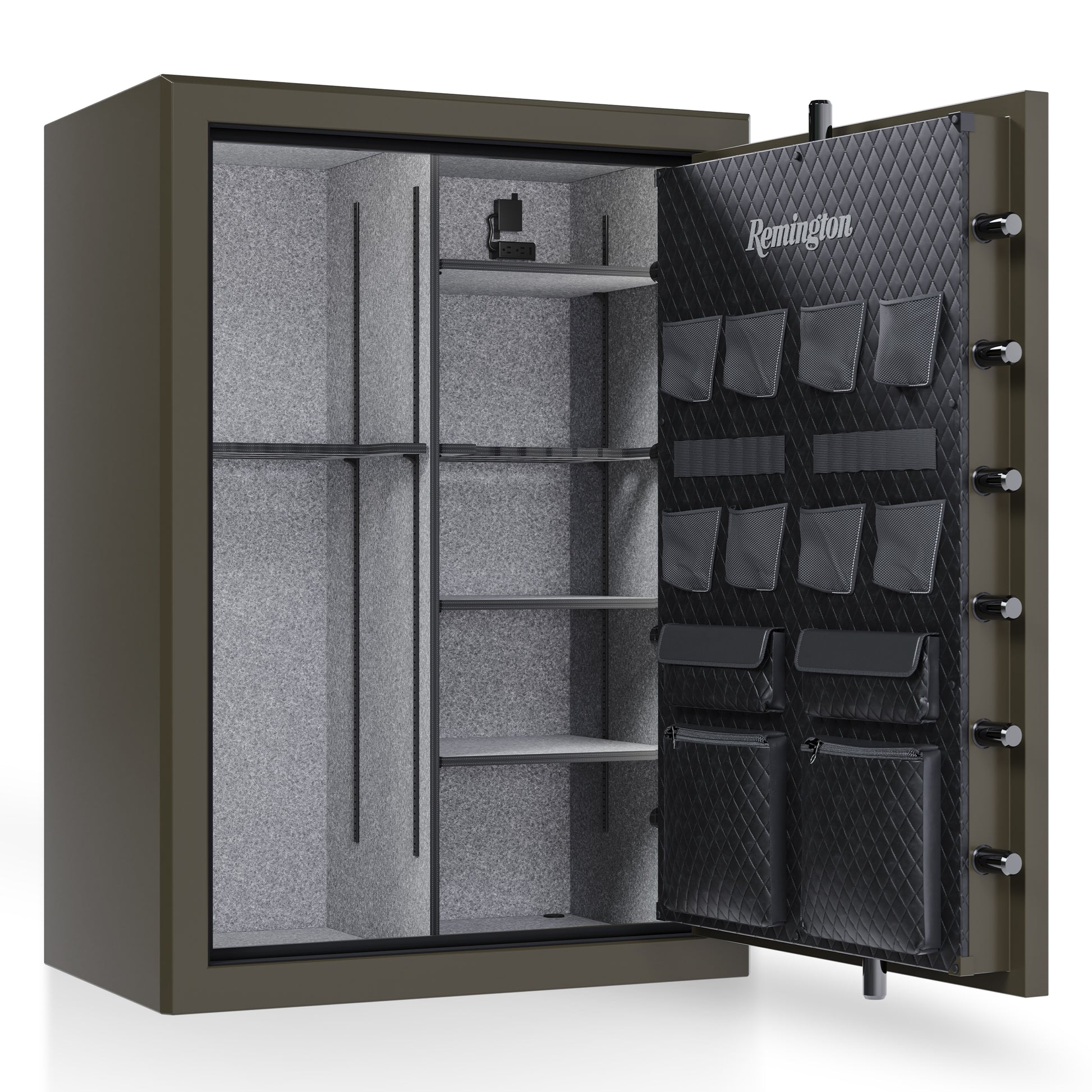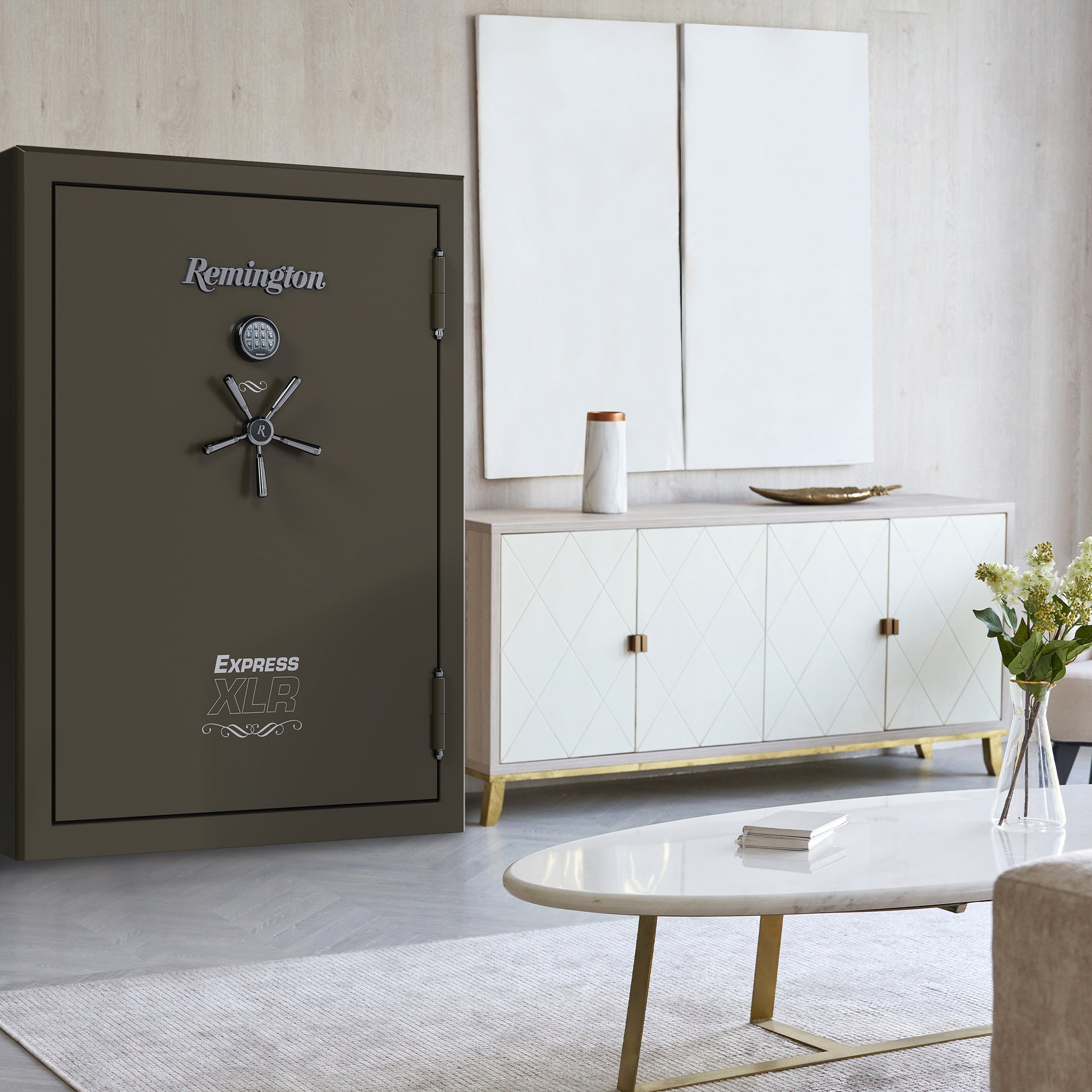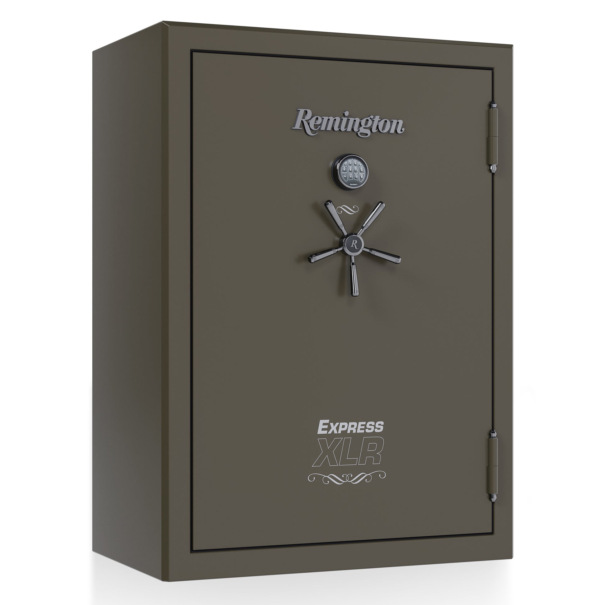 The Remington Express XLR SAR5960E-XLR is a large, versatile safe designed to grow with your collection, securing 60 long guns. It provides a robust 60-minute fire rating at 1650°F and 7-day waterproof protection (2 ft). Security features include an EMP-resistant SecuRam UL-Rated electronic lock and thirteen 1.5" steel bolts. The deep interior offers a power outlet with USB ports, bright lighting, and a premium pocket door organizer. It is CA DOJ approved and backed by a best-in-class Lifetime Warranty.