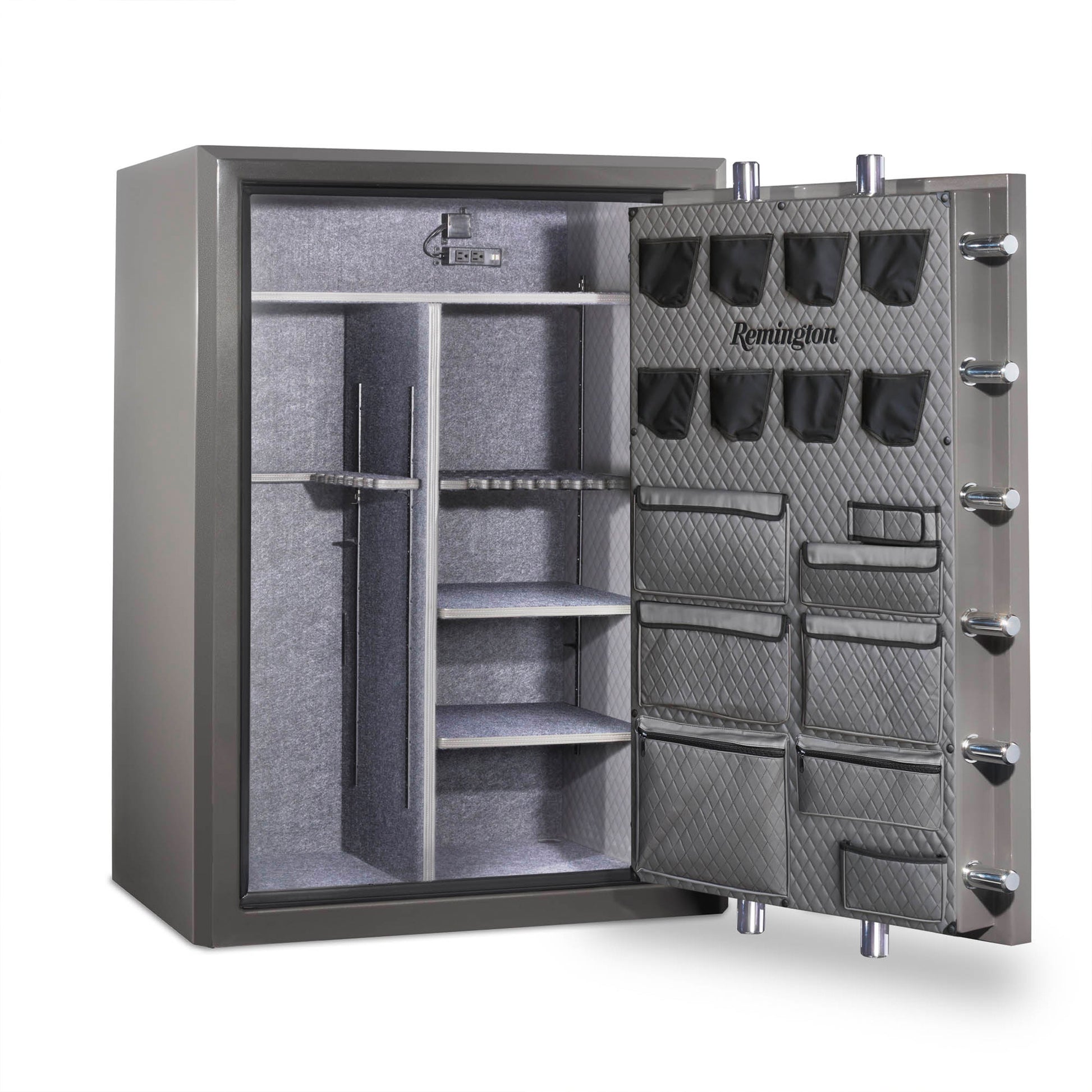 The Remington Nitro SAR6556N provides best-in-class, long-range protection for 56 long guns. It offers an elite 90-minute fire rating at 1800°F and 7-day waterproof protection via Triple Seal technology. Security is unmatched, featuring a UL-Rated EMP-resistant SecuRam lock, 11-gauge steel body, drill-resistant hard plate, and fourteen 1.75" steel bolts. The luxurious interior is fully illuminated with LED lights and features quilted vinyl sidewalls, adjustable shelving, a power outlet with USB ports, and a premium door organizer. It is CA DOJ approved and backed by a Lifetime Warranty.