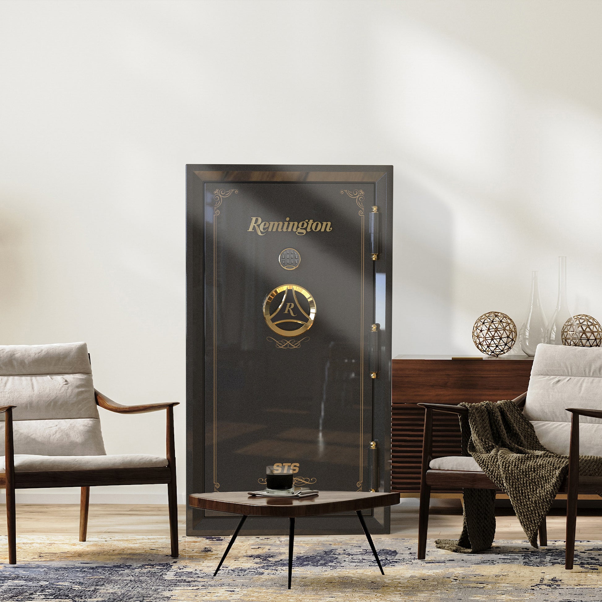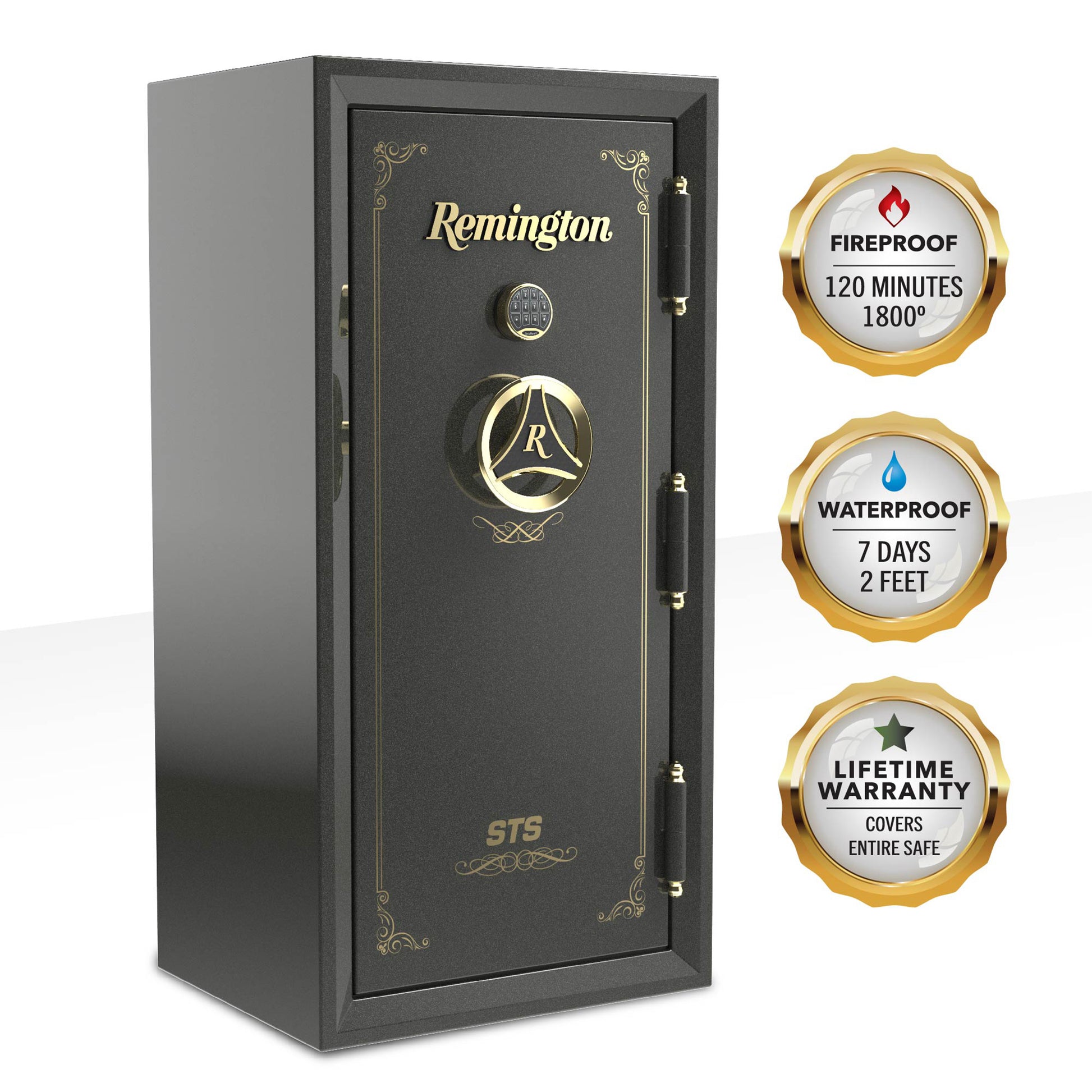 The Remington STS SAR6530S offers premier protection and luxury for 30 long guns. It provides an elite 120-minute fire rating at 1800°F and is waterproof for 7 days in 2 ft. of water. Constructed from 10-gauge steel with fourteen 2" bolts and a UL-Rated EMP-resistant SecuRam lock, it represents unmatched security. The fully quilted, luxurious interior includes glass shelves, LED lighting, a 2-drawer cabinet, and a premium pocket door organizer. It is CA DOJ approved and backed by a best-in-class Lifetime Warranty.
