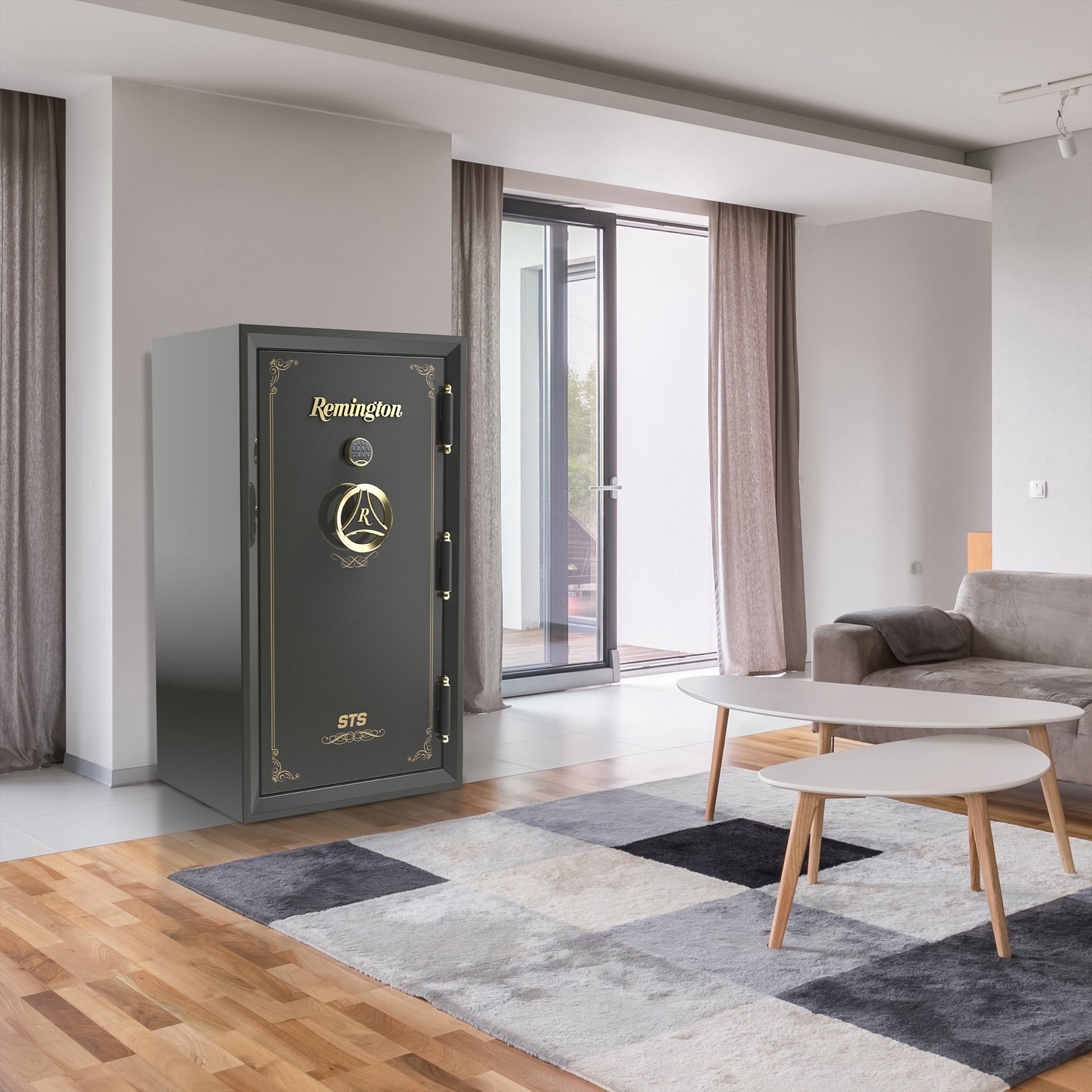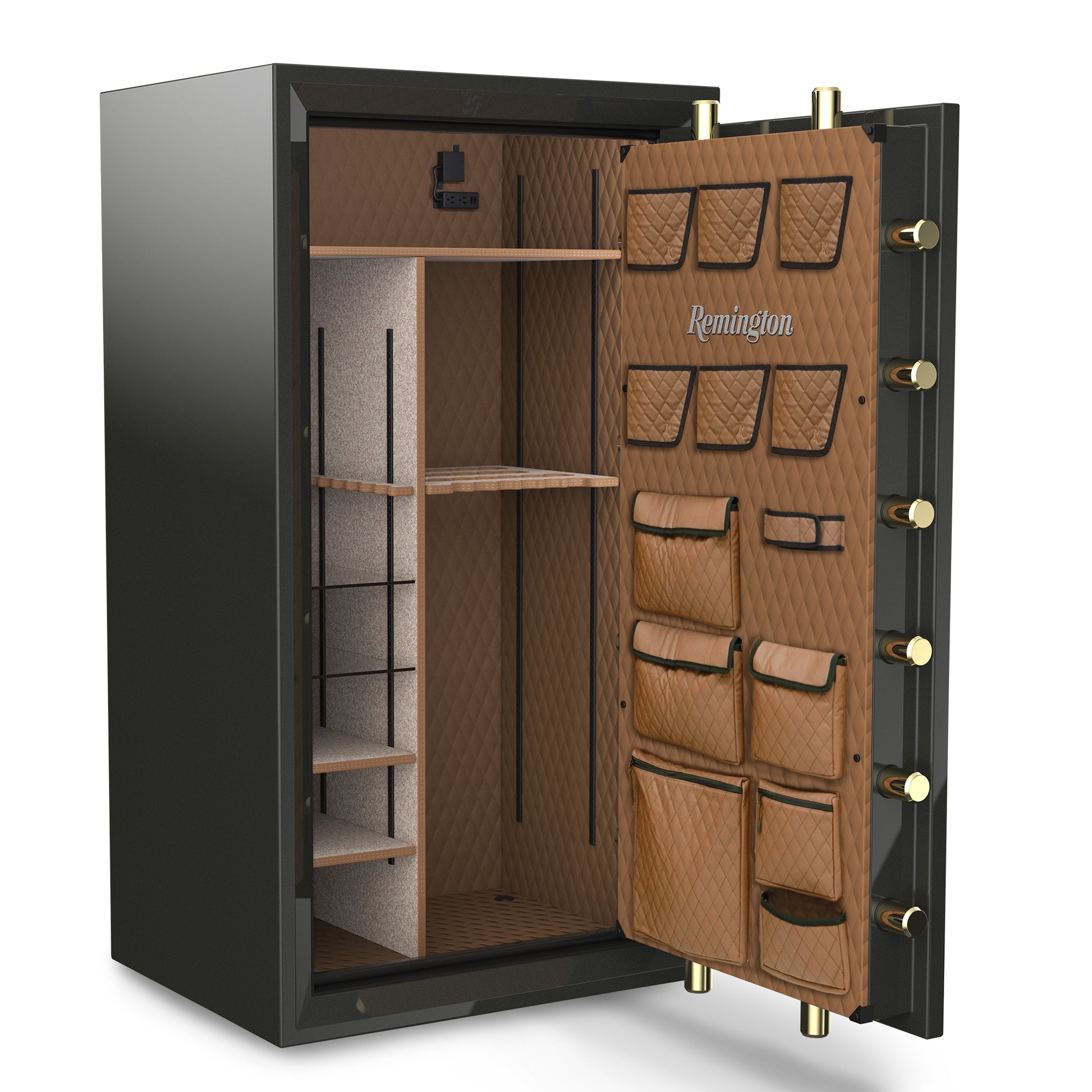 The Remington STS SAR6540S offers premier protection and luxury for 40 long guns. It provides an elite 120-minute fire rating at 1800°F and is waterproof for 7 days in 2 ft. of water. Constructed from 10-gauge steel with fourteen 2" bolts and a UL-Rated EMP-resistant SecuRam lock, it represents unmatched security. The fully quilted, luxurious interior includes glass shelves, LED lighting, a deluxe door organizer, and a UL Rated dual power outlet with 2 USB ports. It is CA DOJ approved and backed by a best-in-class Lifetime Warranty.