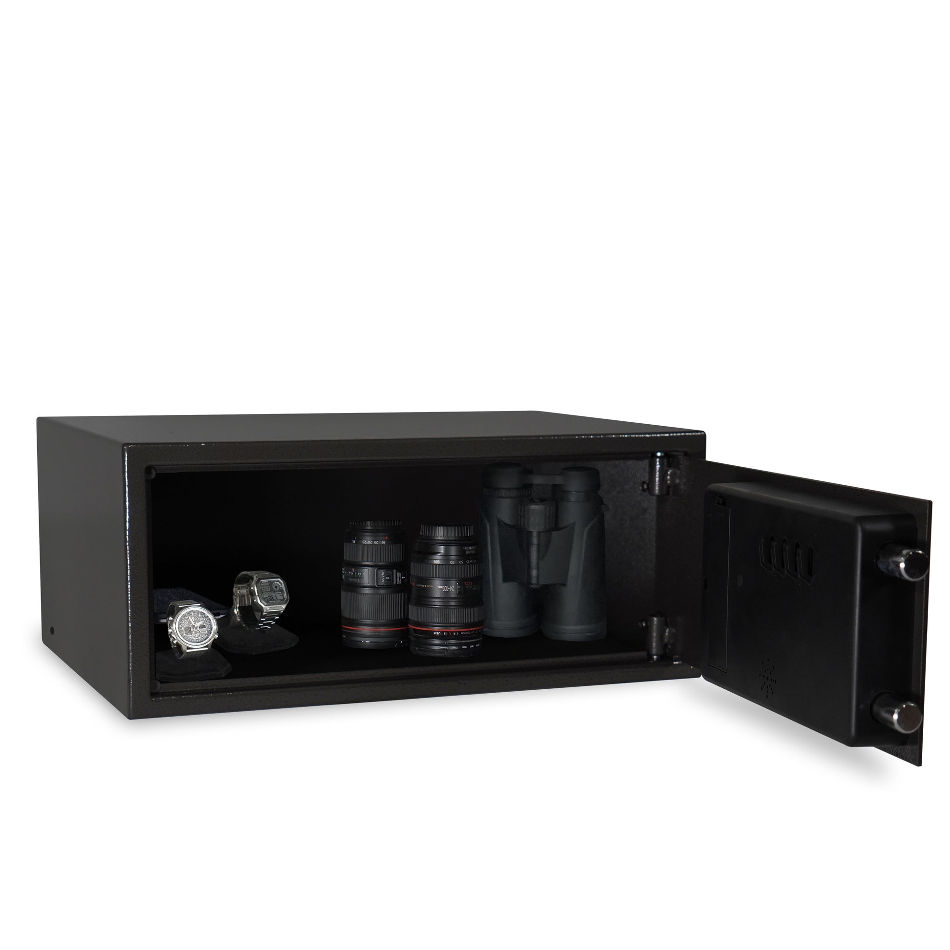 - Locking Mechanism: Fully programmable illuminated electronic lock with 2 override keys