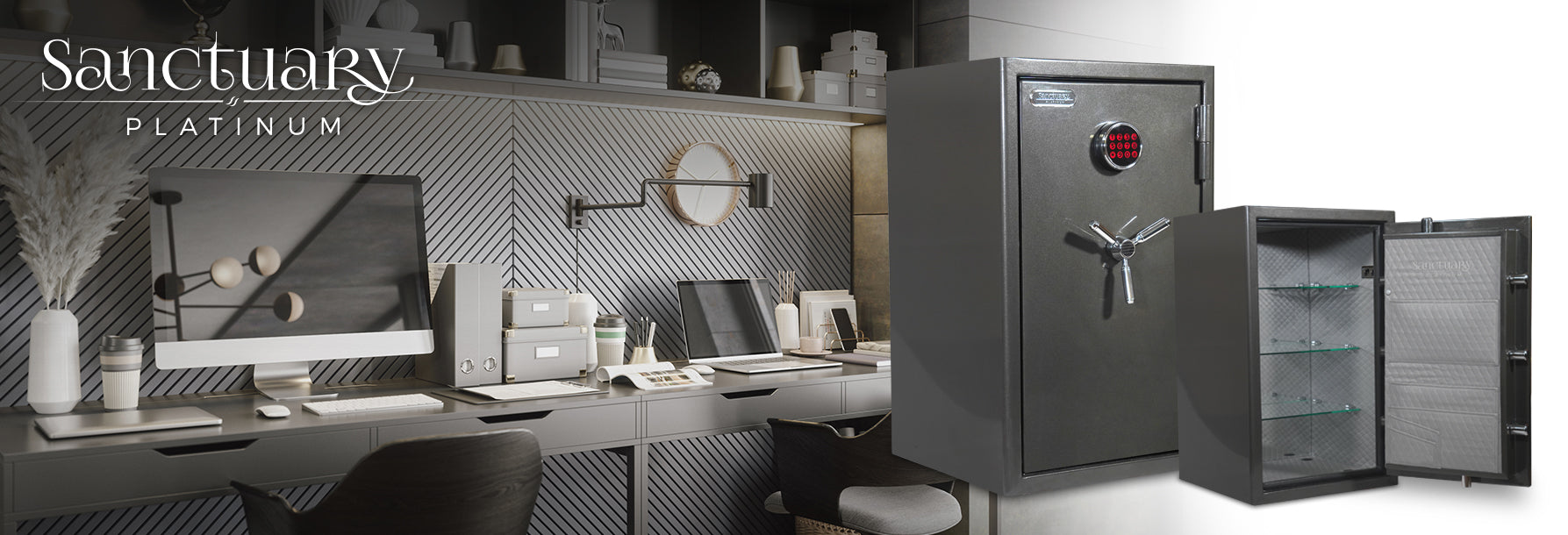 The Sanctuary Platinum SA-PLAT4 offers elite protection with a 120-minute fire rating at an extreme 1800°F and is waterproof for 7 days in 12" of water. It's secured by an innovative Print Guard electronic lock and eight 1.25" steel bolts. The luxurious interior features premium quilted fabric, a mirrored back wall, removable glass shelves, and bright LED lighting. This safe is California DOJ approved and backed by a best-in-class Lifetime Warranty.