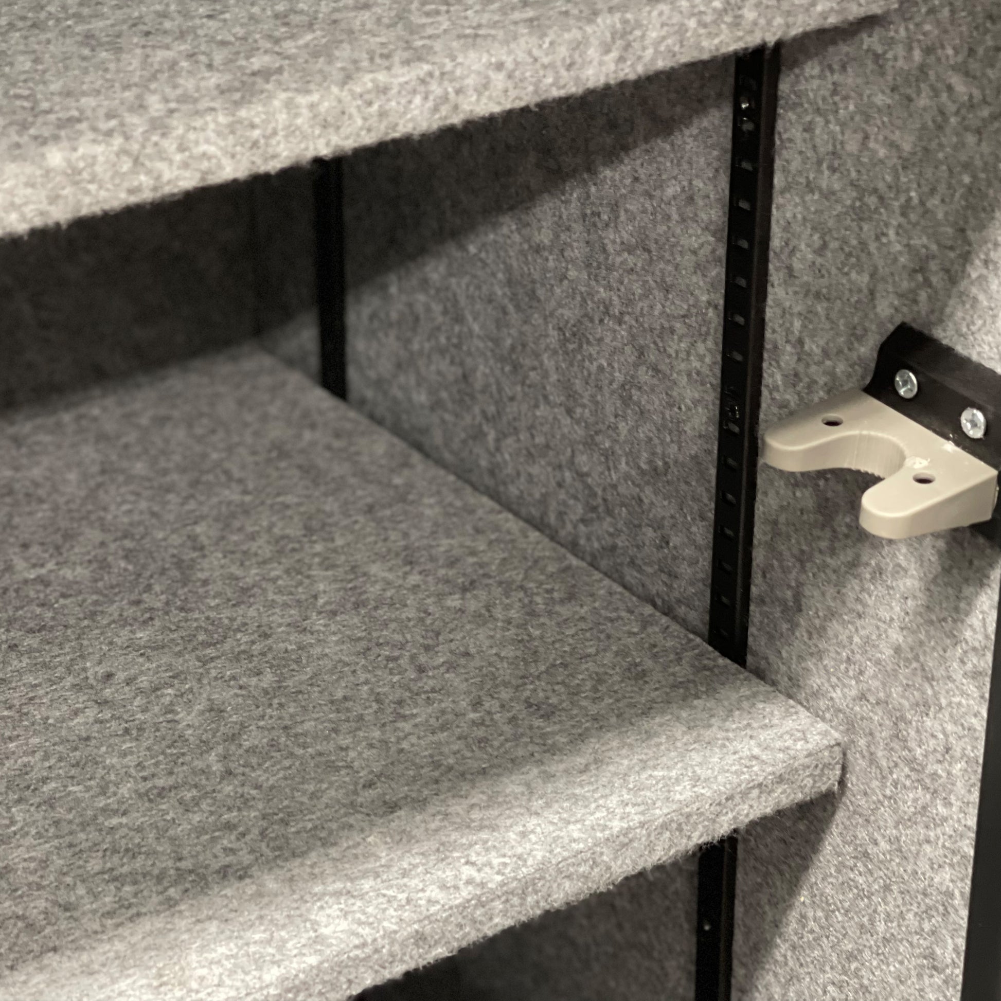 - Shelves: 3 adjustable, steel-reinforced, carpeted shelves
