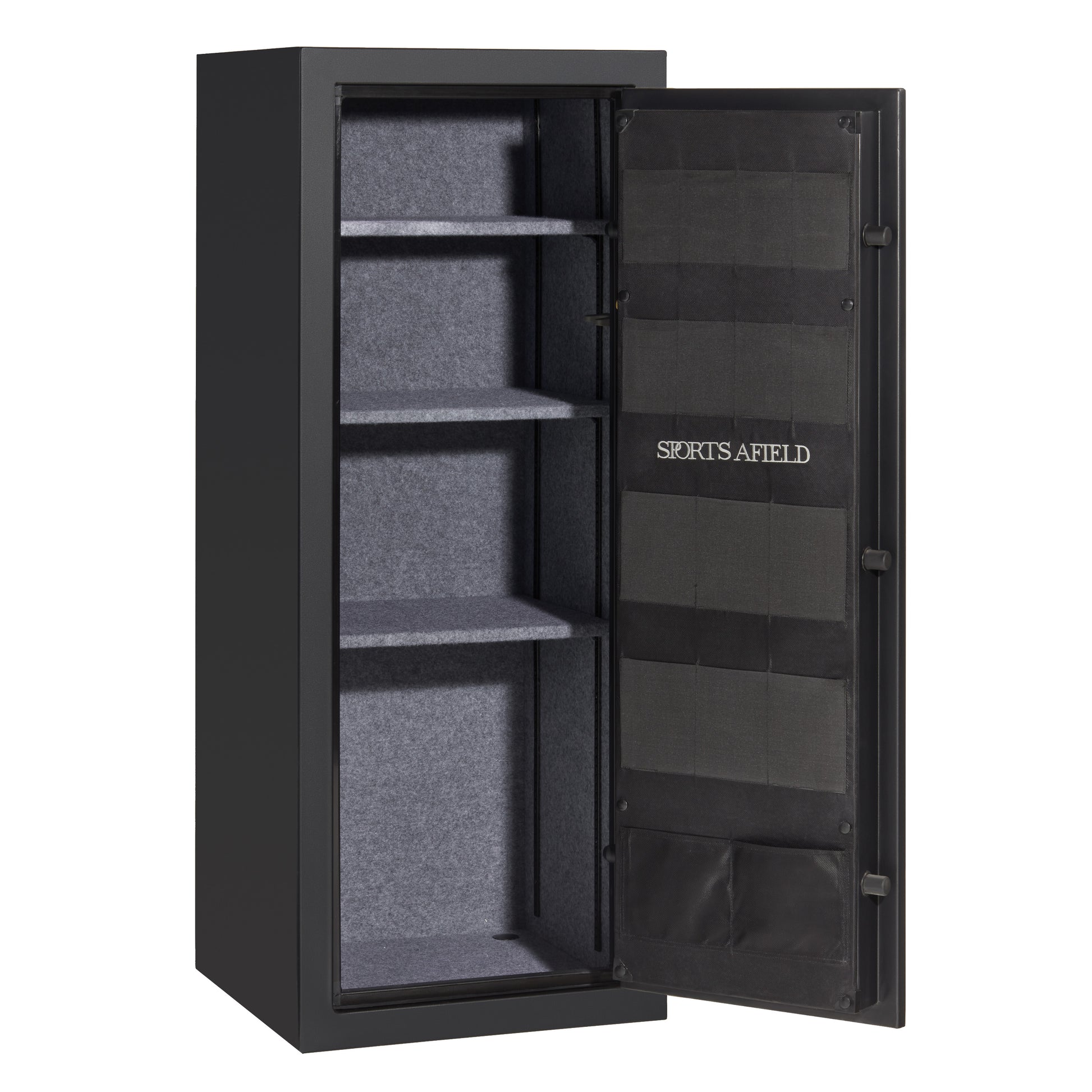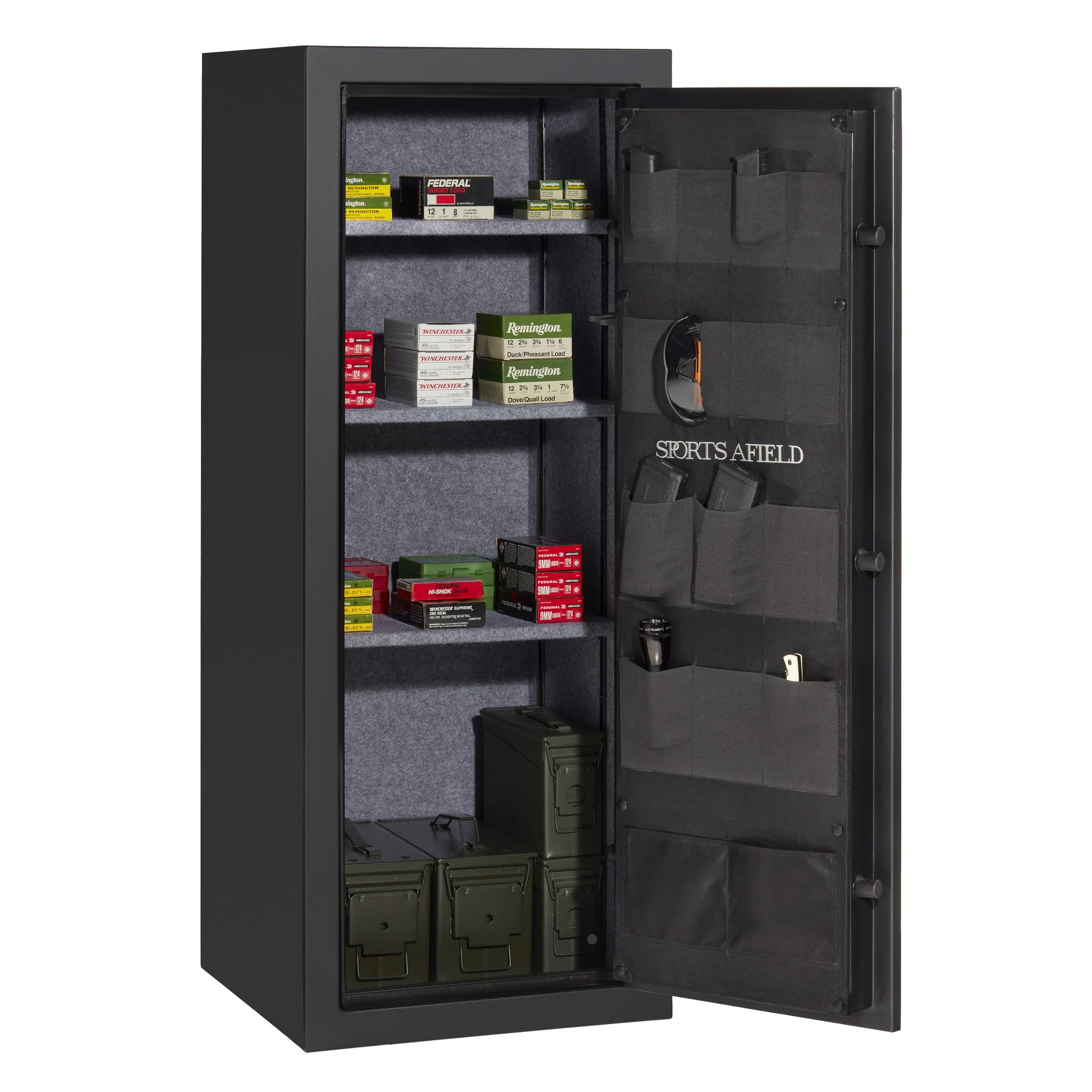 The Sports Afield SA5520LZ-AMG Ammo Safe provides 9.56 cu. ft. of secure, fireproof storage for your ammunition, magazines, and shooting gear. It offers 40-minute fire protection at 1400°F and is built with industrial steel. It features three steel-reinforced shelves, each holding up to 200 lbs. Secured by an electronic lock and five 1" steel bolts, this safe includes a door organizer with stretch pockets and is backed by a best-in-class Lifetime Warranty.